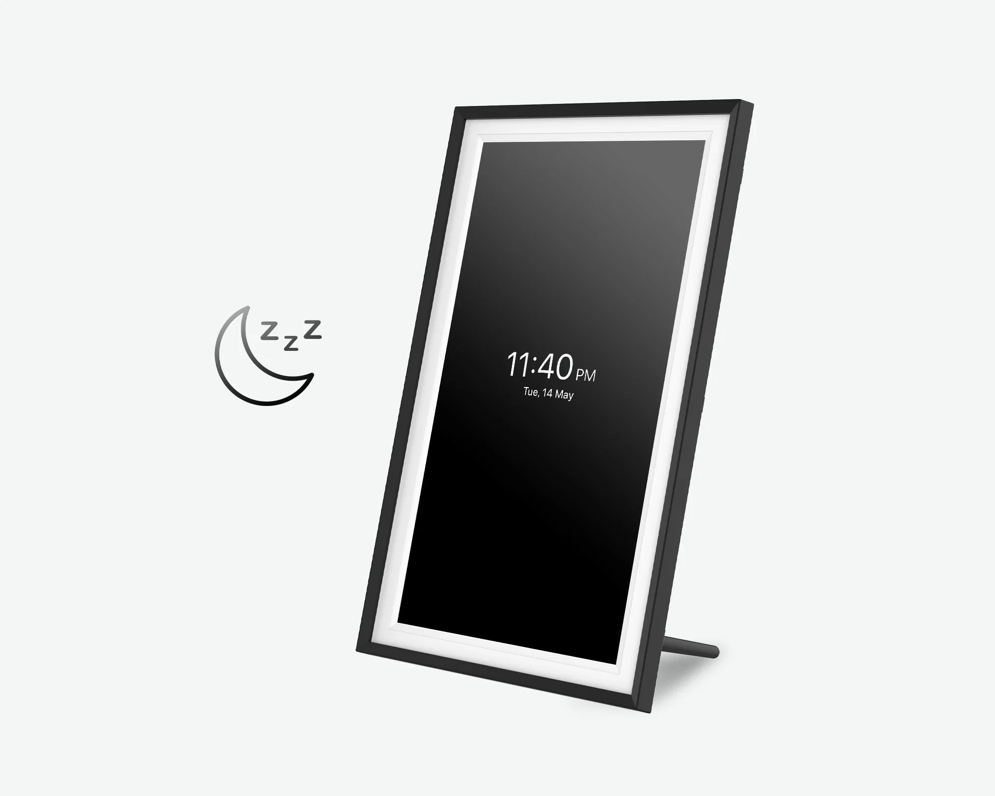 Set time for your frame to automatically power off, without the need of manual operation everyday. During sleep mode, the frame displays a sleek clock for easy time-checking, without having to wake up the display fully.