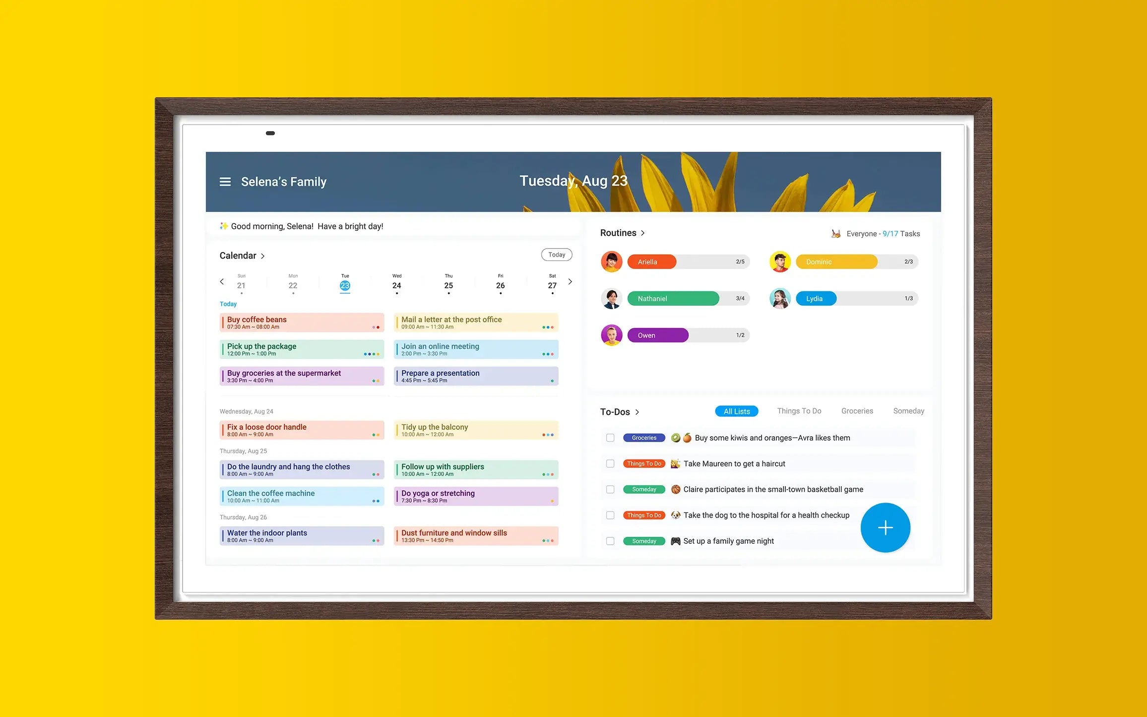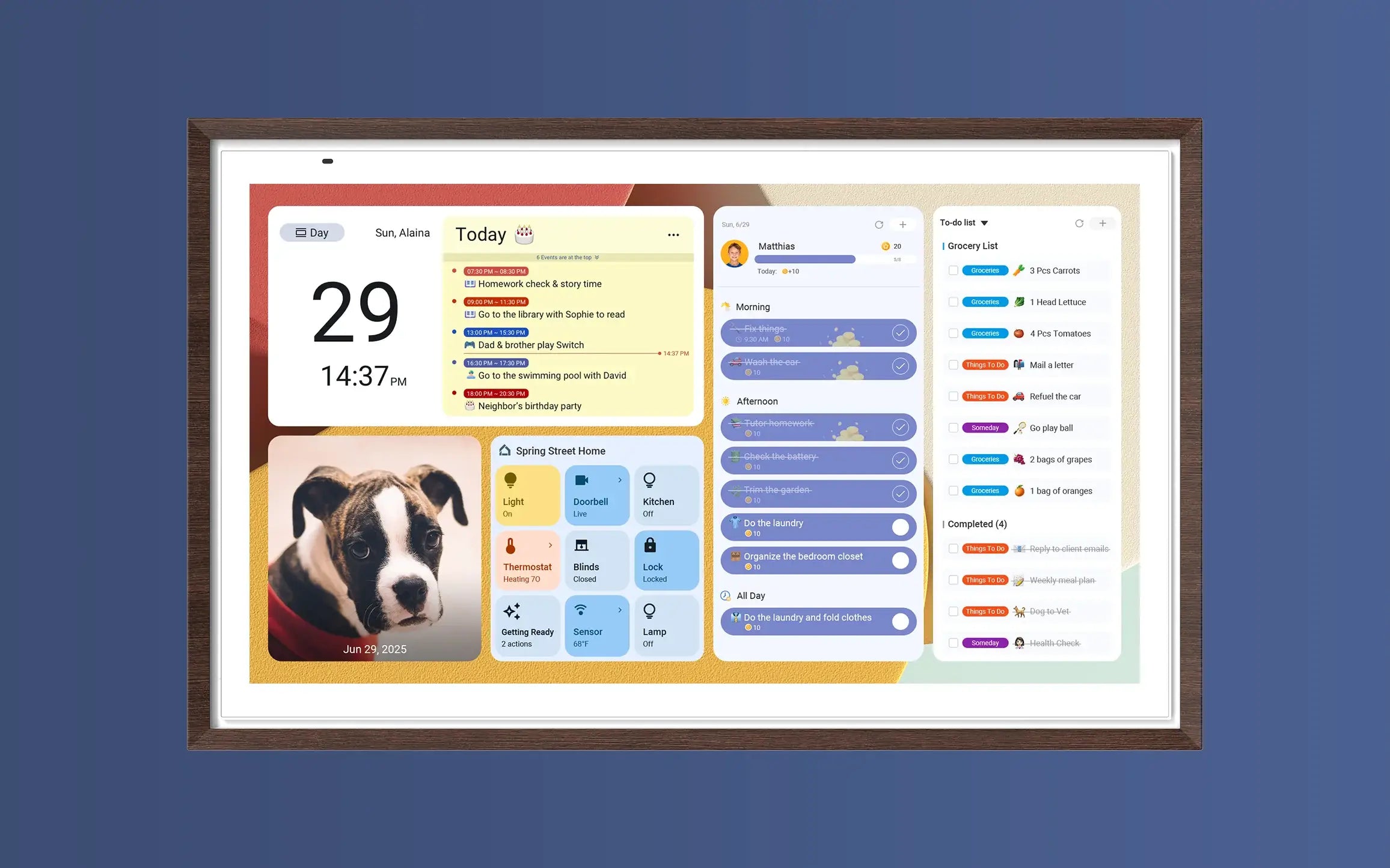 Add and arrange the widgets you need calendar, chores, meals, weather, doorbell, music controls, stocks, and more.